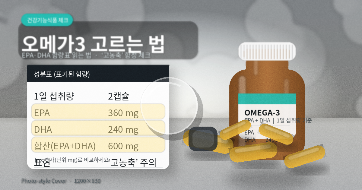 오메가3는 광고 문구가 아니라 EPA·DHA 합산 함량으로 비교해야 합니다. 그 다음이 형태(TG/EE), 산패 관리, 오염물질 검사, 3자 인증 순서입니다.
